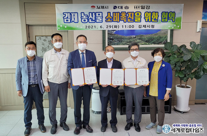 [세계로컬타임즈 글·사진 조주연 기자] ㈜대승과 ㈜일강이 전북 김제시와 지역농산물 소비촉진을 위한 협약을 체결했다.