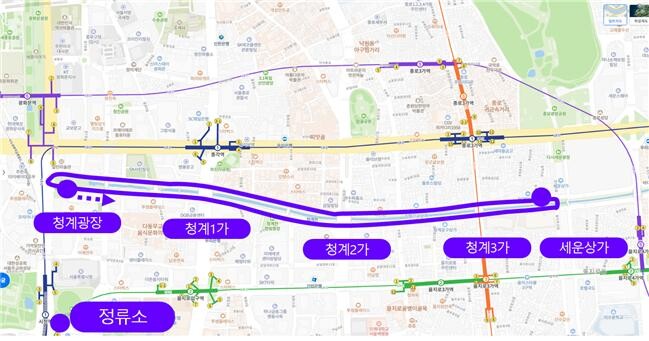 운행구간(사진 위)은 우선 청계광장~세운상가~청계광장까지를 순환하는 총 3.4㎞이며, 충분한 안전검증을 거쳐 내년 상반기까지는 청계 5가까지 운행구간을 연장할 계획이다.
