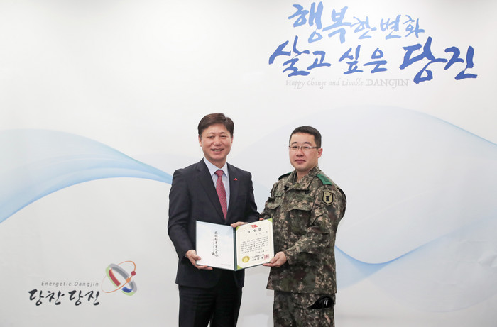 | ▲ 충남 당진시가 육군참모총장으로부터 감사장과 감사패를 받고 있다. |