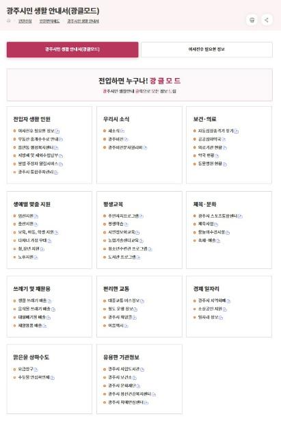 ‘광클모드’는 광주시에 새로 전입한 시민은 물론, 기존 시민들도 복지, 교육, 교통, 문화 등 생활 전반에 걸친 정보를 쉽게 찾을 수 있도록 구성된 맞춤형 생활 안내 플랫폼이다.