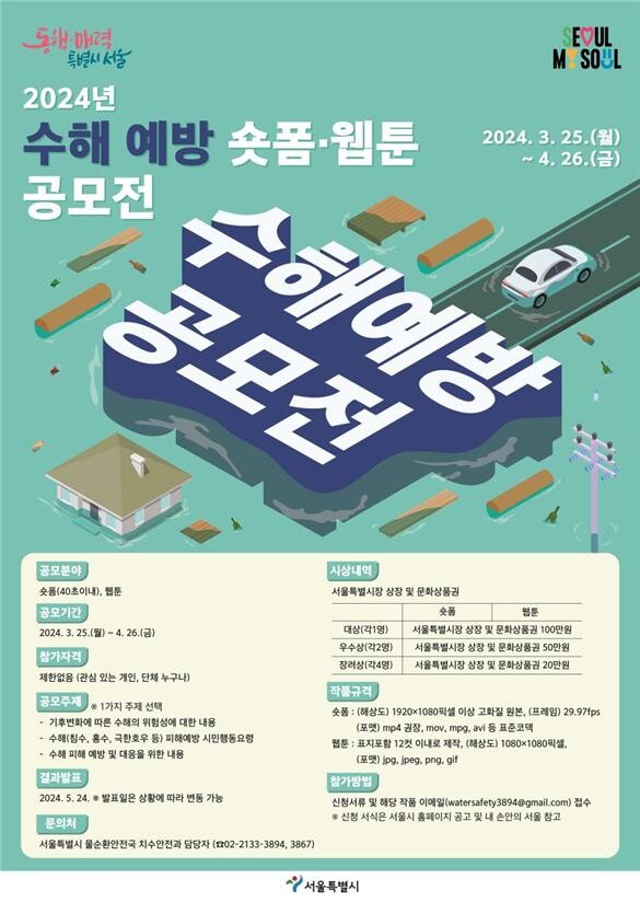 [세계로컬타임즈 이효진 기자] 서울시는 전 국민을 대상으로 ‘2024년 서울특별시 수해 예방 콘텐츠 공모전’을 개최한다.