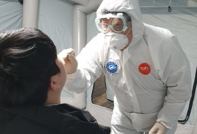 | ▲용인보건소 관계자가 환자 검체를 채취하고 있다. (사진=용인시 제공) |