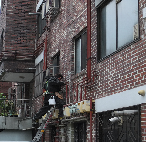 | ▲ 서울 강동구 천호 3동 일대 건물 외벽 가스배관과 창문틀에 특수 형광물질을 도포하고 있는 모습. <사진제공=강동구청> |
