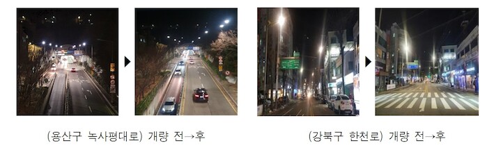| ▲ 노후 가로등 개량 전‧후 도로 전경 |