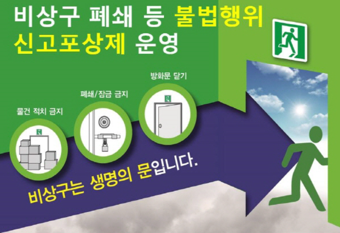 이재근 예방안전과장은 “비상구는 화재발생 시 소중한 생명을 살리는 생명의 문이 된다.”며 “안전의식 및 신고포상제가 확대·전파될 수 있도록 많은 관심 부탁드린다.”고 전했다.