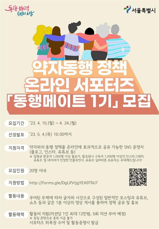 [세계로컬타임즈 이효진 기자] 서울시는 따뜻한 약자와의 동행 가치를 확산할 온라인 서포터즈 ‘동행메이트 1기’(이하 동행메이트) 20명을 10일부터 24일까지 모집한다.
