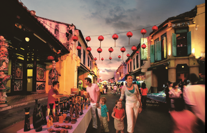 | ▲ 말라카 한 골목에서 한 여행객 가족이 야시장 구경을 하고 있다. |