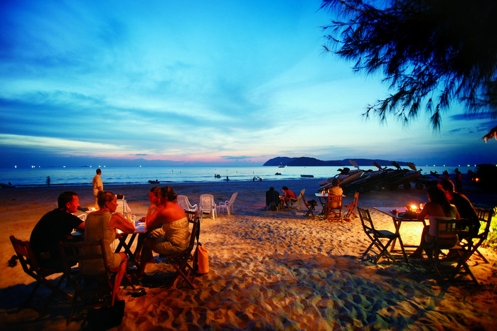 | ▲ 랑카위의 판타이 체낭(Pantai Chenang) 해변에 삼삼오오 모여 앉은 여행객들이 식사와 음료를 마시며 여유롭게 시간을 보내고 있다. |