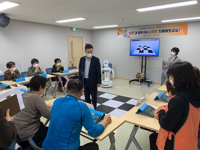 이날 수업은 참여 인원을 소규모로 제한하고, 책상에 투명 가림막을 설치하는 등 코로나19 방역수칙을 철저히 준수하여 진행됐으며, 참여 어르신들은 수업 보조교사인 인지훈련 로봇이 보여주는 동작을 따라 하는 등 치매 예방 교육을 받았다.