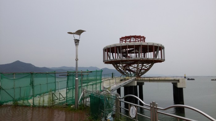 | ▲ 1년 여 동안 공사 중단된 채 서 있는 마량놀토 무대 옆 해상 북카페 모습. |