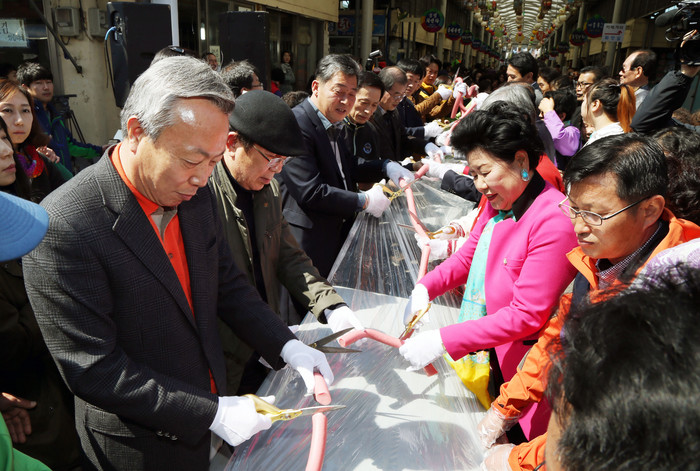 | ▲ 지난해 열린 하동 봄나물장터에서 참석자들이 가래떡을 자르고 있는 모습.<사진제공=하동군청> |