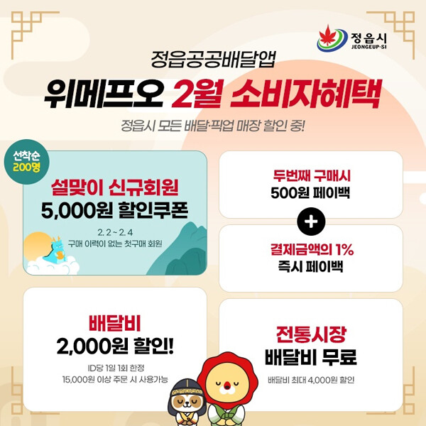 여기에 정읍사랑상품권으로 결제 시 10% 할인 혜택까지 받을 수 있다. 또한 1일 1회 배달료 최대 2000원 할인 쿠폰 행사도 함께 진행된다.