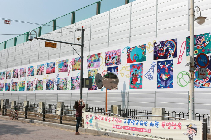 6일 강동구에 따르면 일반적으로 공사장 가설울타리는 먼지와 소음의 퍼지는 것을 막는 시설물로만 인식돼 왔다. 구는 이곳을 어린이들이 창의성을 마음껏 뽐낼 수 있는 미술 갤러리(높이 3m, 길이 60m)로 탈바꿈시켰다.