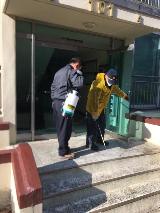 망포1동의 삼정라츠 등 8개 아파트 단지도 공동현관문과 승강기 등을 자체 소독하며 신종 코로나바이러스 예방을 위한 방역작업에 힘을 모았다.