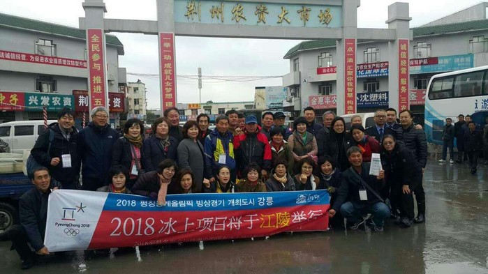 | ▲ 중국 자매도시를 방문중인 강릉시 농업인단체 회원들이 중국 형주시에서 2018 평창동계올림픽 빙상경기 개최도시 강릉을 알리는 현수막을 들고 기념촬영하고 있다.<사진제공=강릉시청> |
