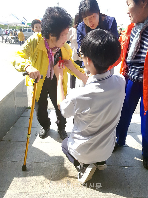 [세계로컬신문 조주연 기자] 9일 오전 전북 김제시가 주최하고 김제제일사회복지관이 주관한 제46회 어버이날 기념행사에서 덕암정보고 학생들이 어르신들 가슴에 꽃을 달며 존경의 마음을 표했다.