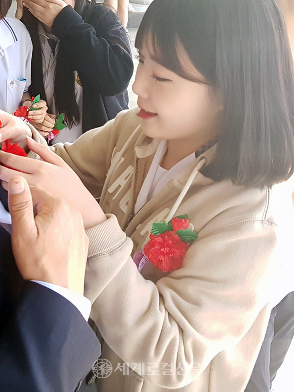 | ▲ 9일 오전 김제시 덕암정보고 한 학생이 어버이날 기념행사 초청자에게 꽃을 달아주고 있다. |