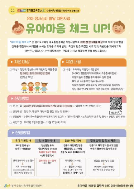 유아마음 체크업은 수원시 관내 어린이집에 재원하는 5세(2019년생) 유아를 대상으로 정서·심리 상태를 점검하고, 맞춤형 치료와 양육자·교사 지원을 제공하는 정서지원 시범사업이다.