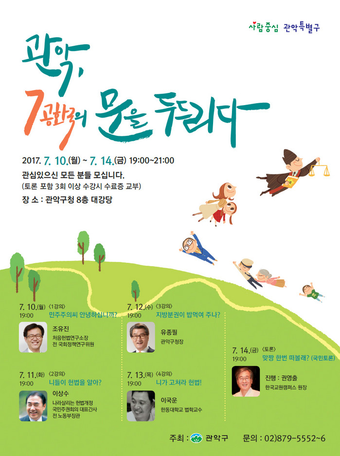 4일 관악구청에 따르면 '관악,7 공화국의 문을 두드리다'라는 주제로 진행하는 이번 강좌는 국민참여 개헌의 공감대를 형성하고 개헌과 지방분권 지역 리더 육성을 위해 마련됐다.