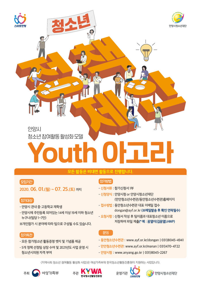 한편, 유스 아고라 참여를 희망하는 청소년(안양시 중·고교생 또는 14세∼19세)은 안양시·안양시청소년재단, 만안·동안청소년수련관 홈페이지 알림마당에서 신청서를 작성해 오는 25일까지 제출하면 된다.