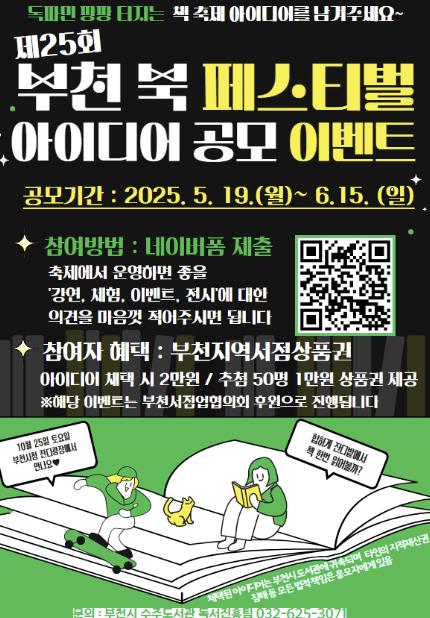 참여는 행사 포스터에 안내된 큐알(QR)코드를 통해 접속해 아이디어를 제출하면 된다. 공모 참여자 중 50명을 추첨해 부천지역서점 도서쿠폰 1만 원권을 제공하며, 채택된 아이디어에는 도서쿠폰 2만 원권을 제공한다.