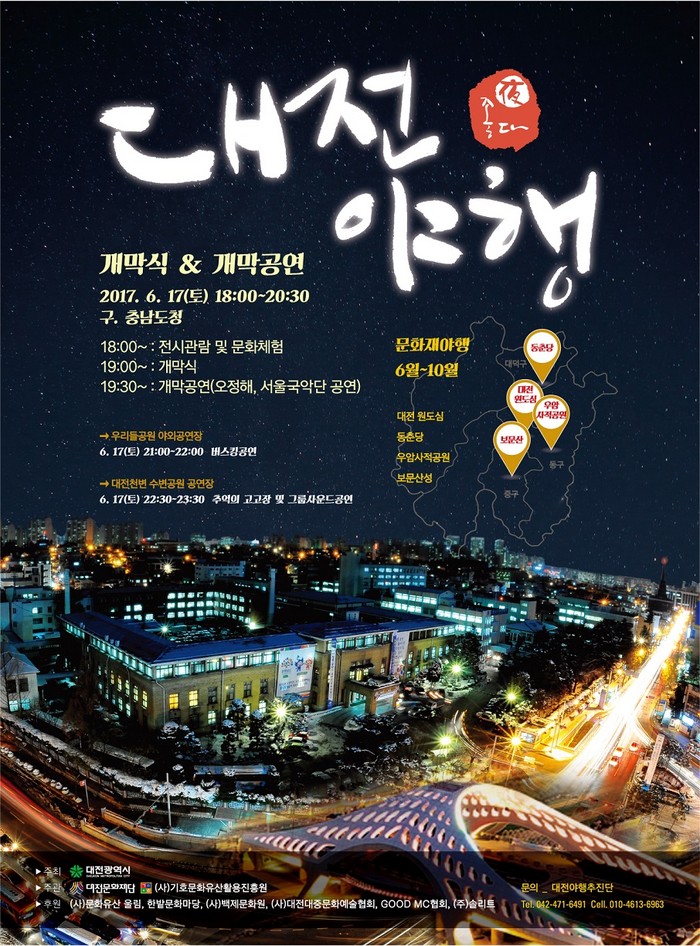 ‘夜 좋다‘는 대전에서는 처음으로 열리는 문화재 야행 프로그램으로 시가 주최하고 대전문화재단과 기호문화유산활용진흥원이 공동으로 주관하며 지역의 문화유산 단체 등이 후원한다.