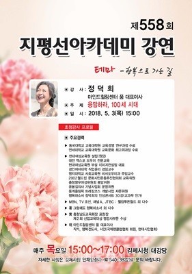 행복전도사, 작가, 시인 다방면으로 활동하고 있는 정덕희 마인드힐링센터 품 대표는 제558회 김제 지평선아카데미에 초청돼 3일 오후 3시 김제시청 지하대강당에서 강의를 진행한다.