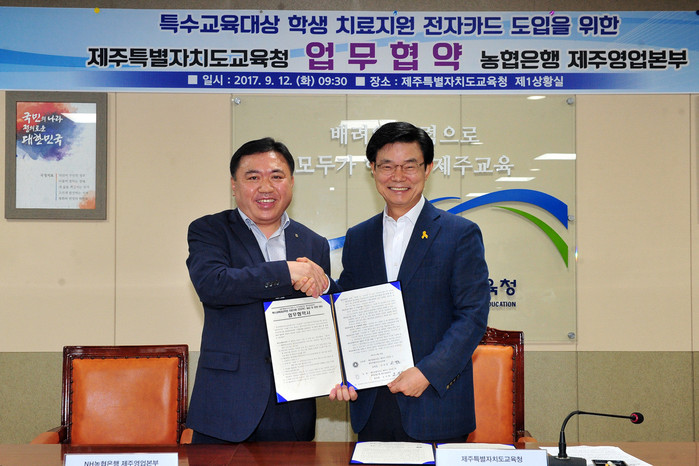 [세계로컬신문 김영주 기자] 제주특별자치도교육청(교육감 이석문)은 12일 오전 NH농협은행 제주영업본부(본부장 고석만)와 특수교육대상학생 치료지원 서비스 전자카드 시스템 도입을 위한 업무 협약을 체결했다고 밝혔다.