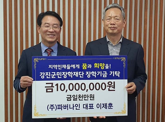 전남 강진군은 지난 17일 강진군 작천면 신기마을 출신 파버나인 이제훈 대표가 지역 인재 육성에 써달라며 장학금을 기탁했다고 19일 밝혔다.