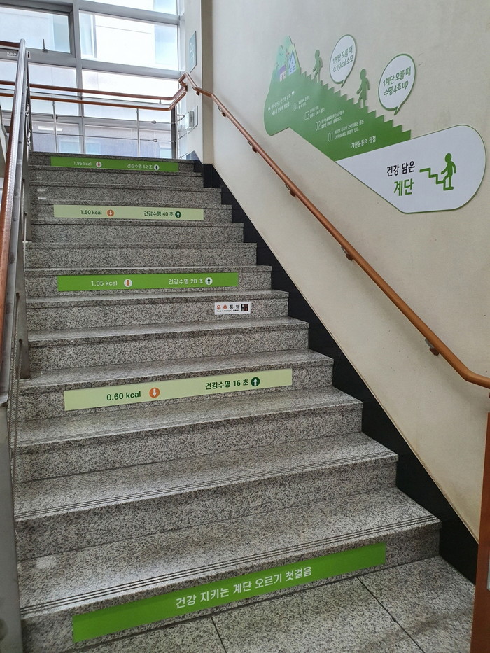 특히, 층별 계단과 벽면 판넬에는 칼로리 소모량, 건강수명 증가시간 문구뿐만 아니라 만성질환 예방을 위한 영양관리 등 건강생활실천 문구를 표기해 시민들의 건강생활실천에 관한 관심을 높이도록 했다.