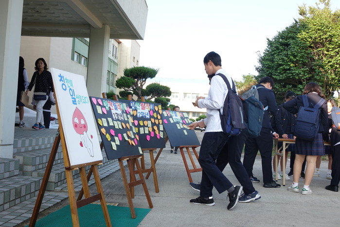 | ▲ 함덕중학교 학생들이 10일 오전 칭찬릴레이 게시판에 글을 써서 붙이고 있다.<사진제공=제주도교육청> |