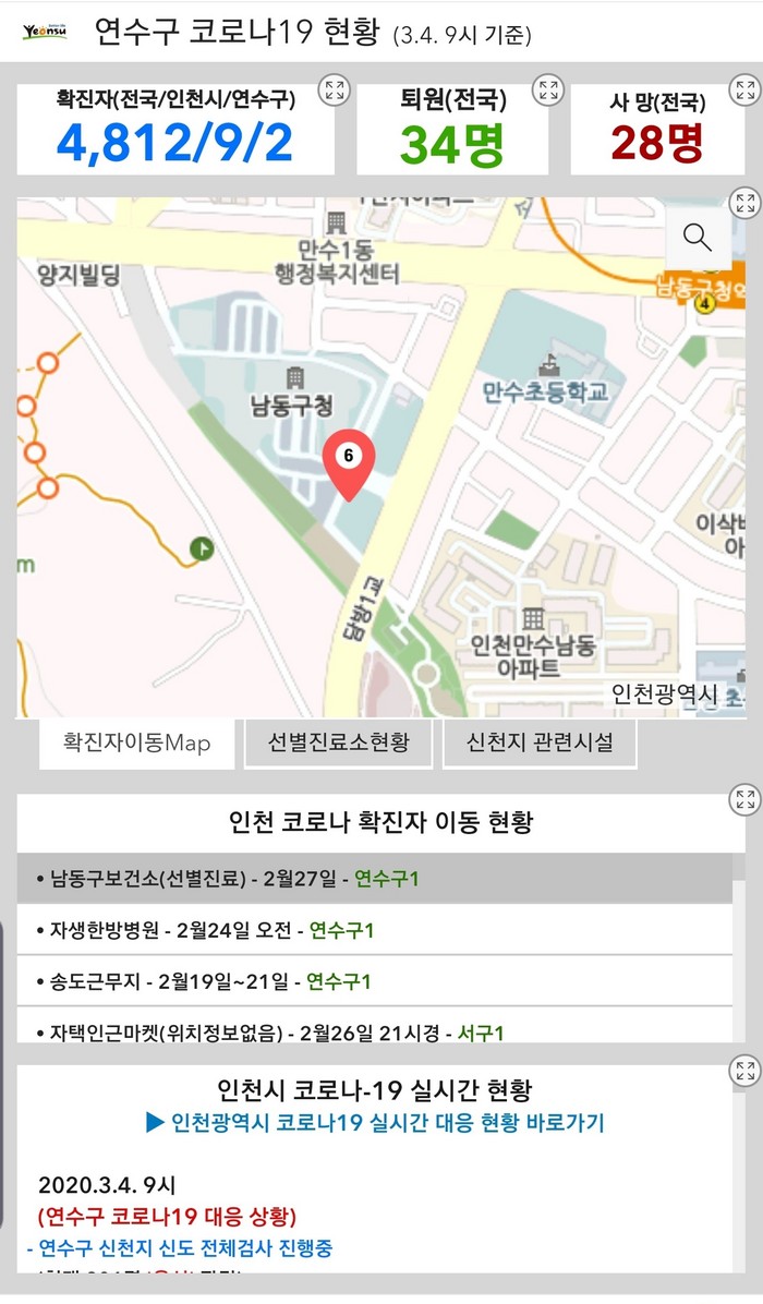 [세계로컬타임즈 장선영 기자] 인천시 연수구는 확진환자 이동 동선과 선별진료소·신천지 관련 시설 등을 모바일로 한눈에 확인할 수 있는 ‘연수구 코로나19 현황지도’를 자체 제작해 모바일 서비스를 시작했다.