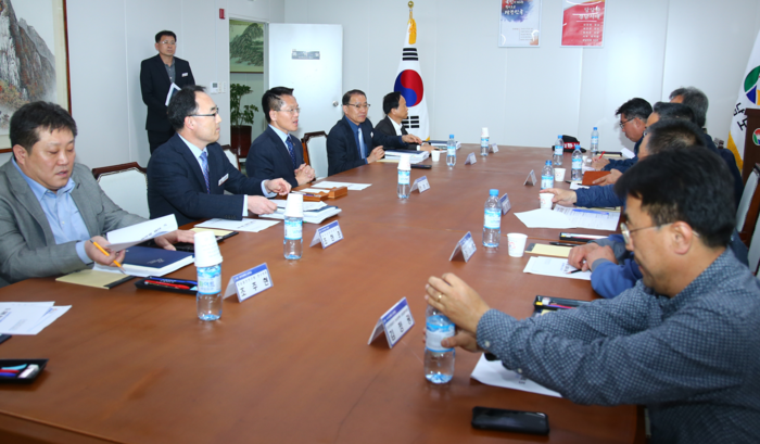 | ▲ 28일 조선업살리기 경남대책위 요청에 따라 열린 긴급간담회에서 한경호 도지사 권한대행과 조선업 노조 관계자들이 회의를 하고 있다. <사진제공=경남도청> |