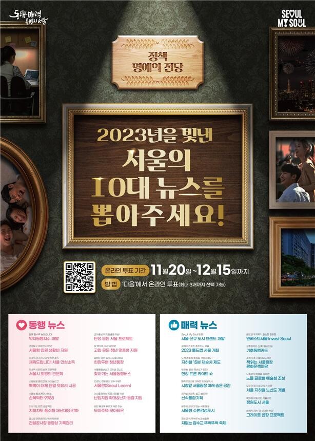 ‘2023년을 빛낸 서울의 10대 뉴스’ 투표 페이지는 서울시 누리집 배너 또는 포털사이트(다음 및 네이버)에서 ‘서울’, ‘서울 10대 뉴스’를 검색하면 바로 확인할 수 있다.