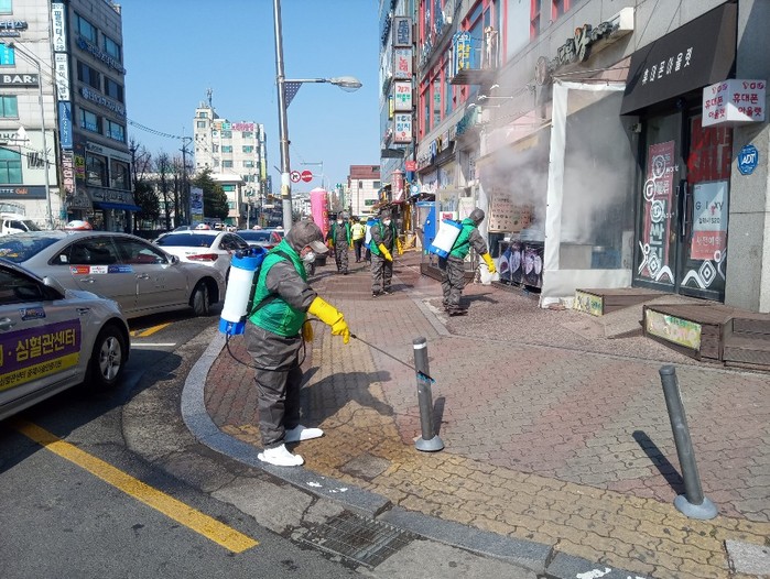 | ▲ 새마을지도자 김포시 협의회에서 코로나19 확산 방지를 위해 방역을 하고 있다. (사진=김포시 제공) |