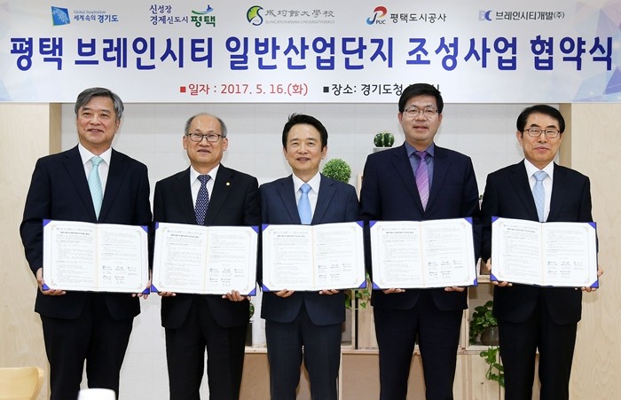 남경필 경기도지사와 공재광 평택시장, 정규상 성균관대학교 총장, 이연흥 평택도시공사 사장, 윤용오 브레인시티개발㈜ 대표는 지난 16일 오후 경기도청 상황실에서 이 같은 내용을 담은 ‘브레인시티 사업 협약’을 체결했다.
