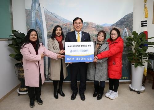 | ▲ 필리핀 이주여성 모임이 충북 괴산군민장학회에 장학금 50만원을 기탁하고 기념촬영을 하고 있다. <사진제공=괴산군청> |