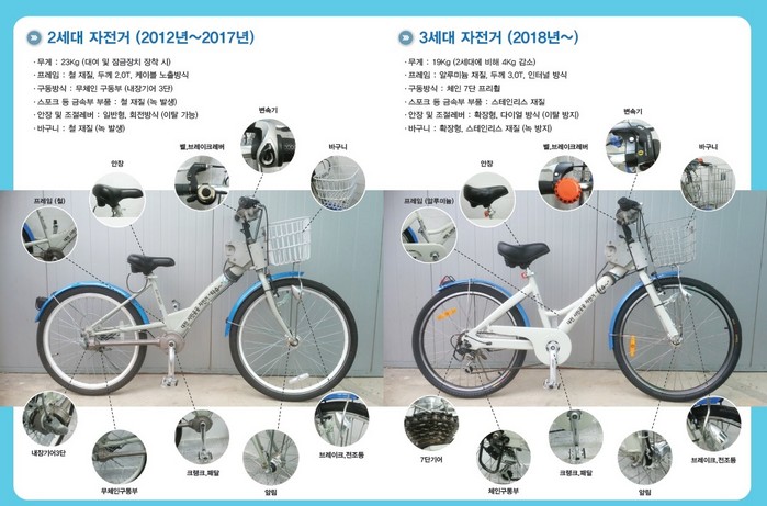또 이용자 의견을 반영해 안장 높낮이를 보다 편리하게 조절할 수 있도록 개선하였으며 고장이 잦은 벨과 녹이 많이 발생하는 바구니도 새로운 재질로 교체했다.