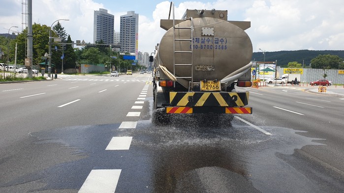 | ▲ 폭염에 대비해 살수차가 물뿌리기를 하고 있다. (사진=용인시 제공) |