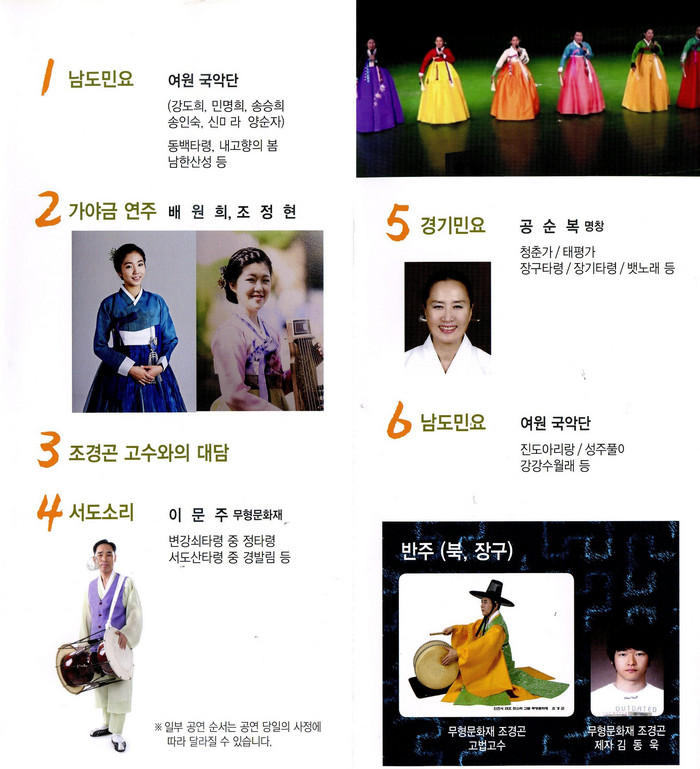 공연은 ▲남도민요(여원국악단) ▲가야금 연주(배원희, 조정현) ▲서도소리(이문주 무형문화재) ▲경기민요(공순복 명창) ▲남도민요(여원국악단) 순이다.
