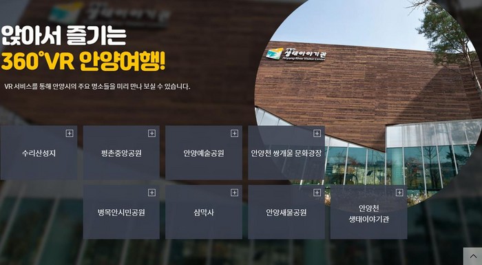 ‘VR여행’ 에 입장하면 ‘앉아서 즐기는 360°VR안양여행’ 메뉴를 통해 수리산성지, 평촌중앙공원, 안양예술공원, 안양천 쌍개울광장, 별목안시민공원, 삼막사, 안양새물공원, 안양천생태이야기관 등 8곳 명소를 360°로 회전하며 입체적 감상할 수 있다.