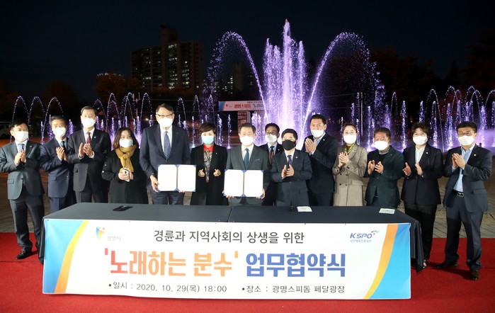| ▲ 광명시는 ‘노래하는 분수’ 준공식을 개최하고 국민체육진흥공단과 노래하는 분수 운영을 위한 업무협약 체결했다. (사진=광명시 제공) |