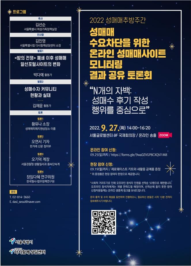 이에 서울시는 22일 서울 글로벌센터 9층 국제회의장에서 시립 다시함께상담센터와 공동으로 ‘성매매 수요차단을 위한 성매매 사이트 모니터링 결과 공유’ 정책 토론회를 개최한다.