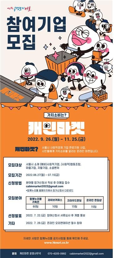 서울시는 오는 9월~11월 온라인 기획전 '가치소비는? 캐빈마켓'을 개최해 오는 7월 15일까지 ‘캐빈마켓’에 참여할 사회적경제기업 100팀을 모집한다.