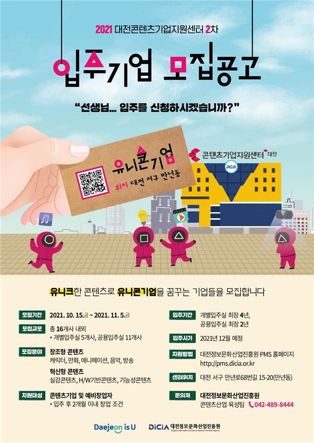 [세계로컬타임즈 민순혜 기자] 대전시는 10월 15일부터 11월 5일까지 ‘대전콘텐츠기업지원센터’(이하 ‘지원센터’)에 입주할 16개 기업을 2차로 모집한다고 18일 밝혔다.