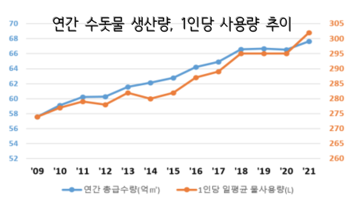 그러나, 서울시의 경우 상수도보급률이 100%로 물 부족을 체감할 수 없는 환경으로, 2020년 환경부 ‘세계물의날’ 자료집에 따르면, 1인당 1일 수돗물 사용량은 서울 308 리터, 런던 149 리터, 파리 187 리터로 유럽 주요 도시의 약 2배이다.