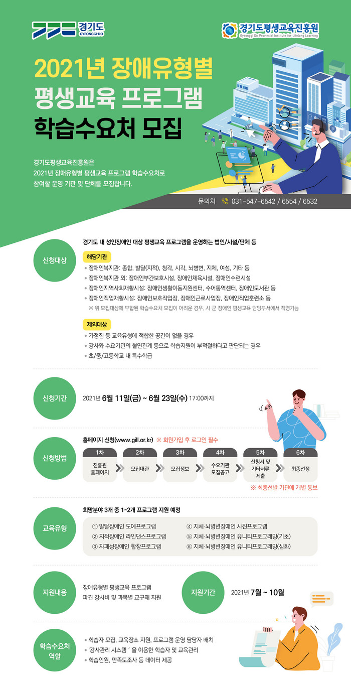 모집 대상은 도내 성인 장애인 대상 평생교육 프로그램을 운영하는 법인, 시설, 단체로, 시·군의 장애인 평생교육 담당 부서에서 교육 프로그램을 운영하면 직접 신청할 수 있다.