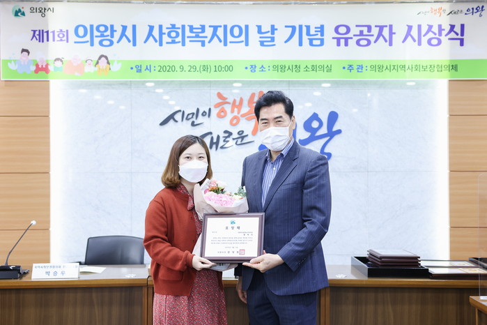 29일 의왕시청 소회의실에서 열린 시상식은 코로나19 확산 방지를 위해 수상자와 관계자만 참여한 가운데 표창 수여식과 간단한 간담회만 진행했다.