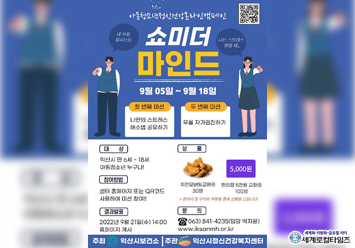 [세계로컬타임즈 조주연 기자] 전북 익산시가 청소년 정신건강을 챙기는 온라인 캠페인을 진행한다. 상품도 마련했다.