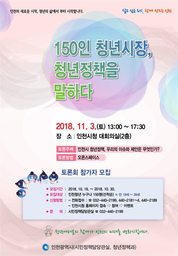 16일 인천시는 "오는 11월 3일 인천거주 청년들과 소통하고 청년의 관점에서 시 정책을 바라보기 위해 '인천시 청년정책, 우리의 이슈와 제안은 무엇인가'라는 토론 주제로 '150인 청년시장, 청년정책을 말하다' 토론회를 인천시청 대회실에서 개최한다"고 밝혔다.